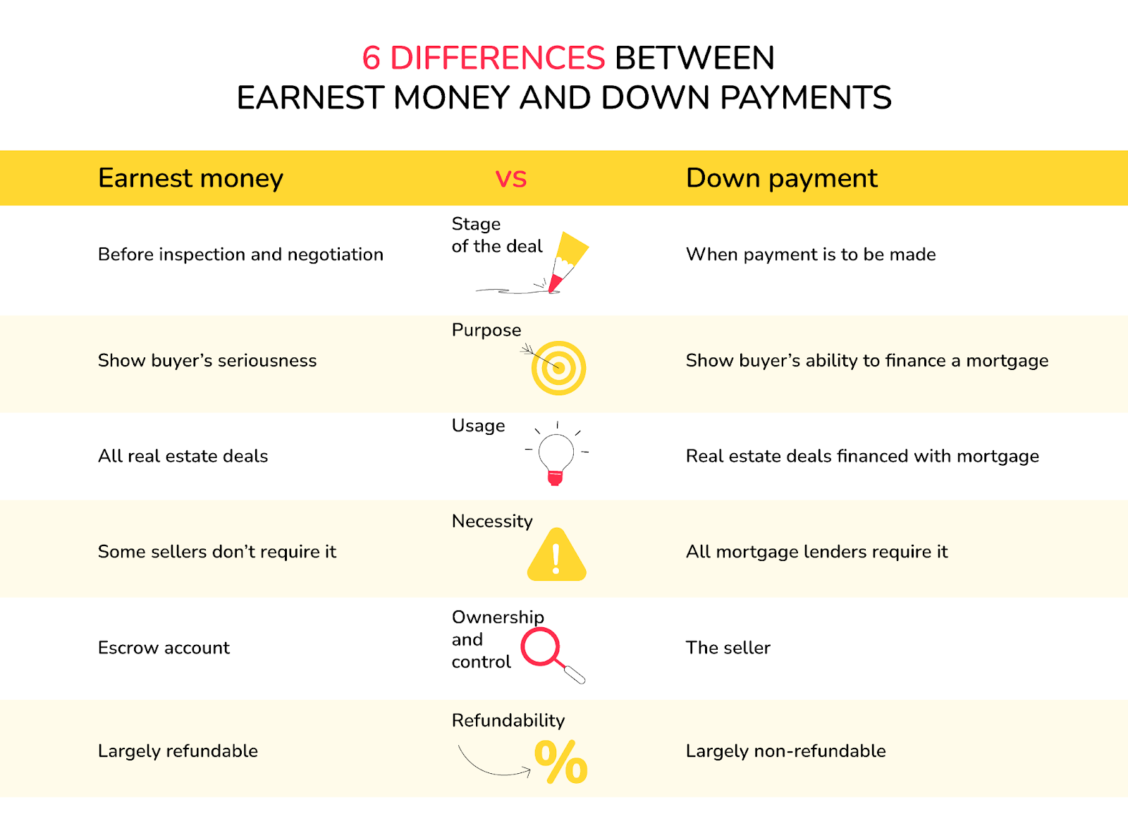 Having clarified the similarities, let’s turn to the six differences between earnest money and down payments: