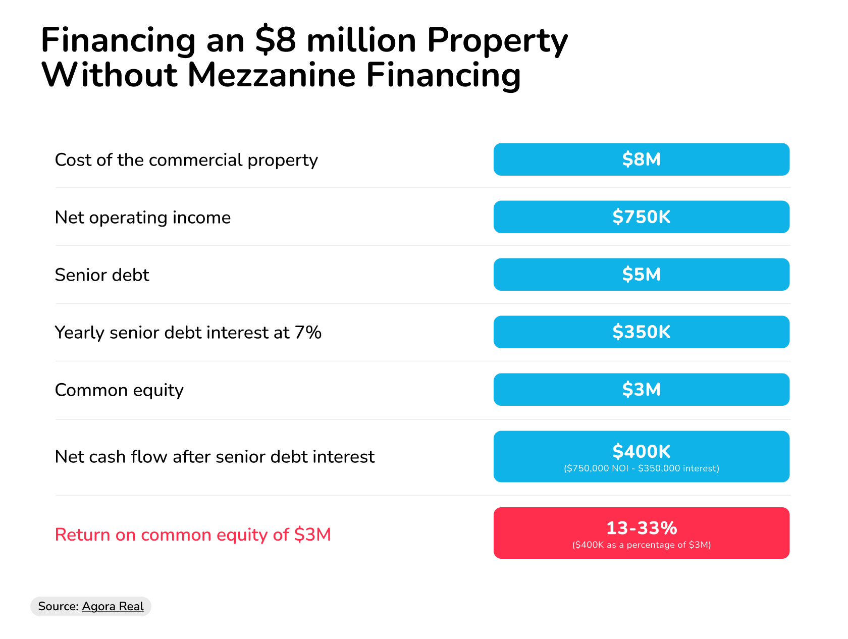 Suppose a commercial property costs $8 million and has a net operating income (NOI) of $750,000. The senior debt is $5 million at an interest rate of 7% per year (yearly interest payment of $350,000). This leaves a $3 million funding gap. If you don’t use mezzanine financing, you need an equity contribution of $3 million.